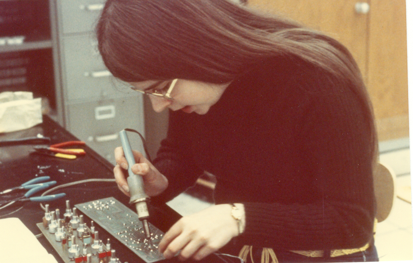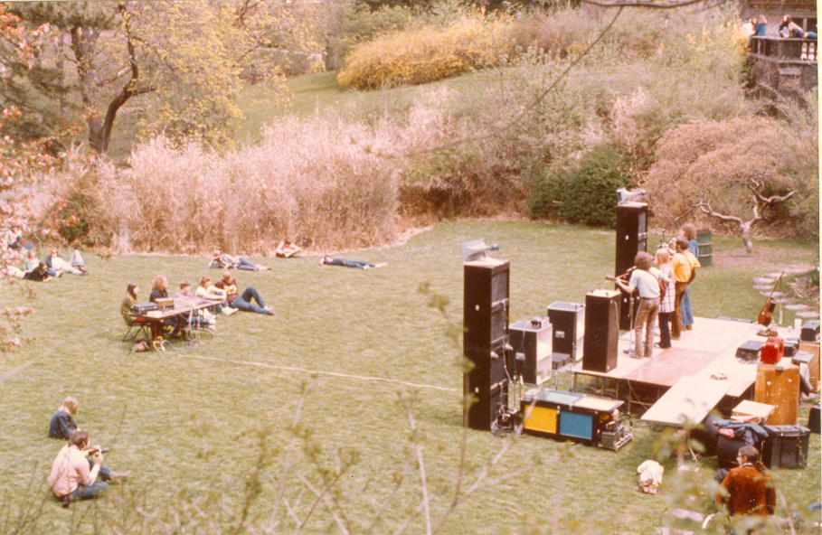 The group at Carnegie Mellon’s WRCT radio station not only recorded classical music and produced Scotch and Soda records but also did live sound for concerts. The concert pictured was at Chatham College in 1972. Brian Rosen, who also mixed about a third of the famous Woodstock concert, headed up the sound reinforcement crew. He also worked for the CMU Computer Science engineering lab where we designed and built our mixing boards and power amplifiers. The board shown below was hand laid out with black crepe tape and then photographed and photo-etched in house and then hand soldered. Each of the nine modules was interconnected with a ribbon cable. The resulting twelve channel stereo board was only 3 inches deep and 19 inches high by 32 inches wide. The eight foot speaker columns were built in two sections, the bottom section having wheels. Each column was topped with a commercial horn speaker. The whole system was powered by four – hundred watt lunchbox amplifiers.