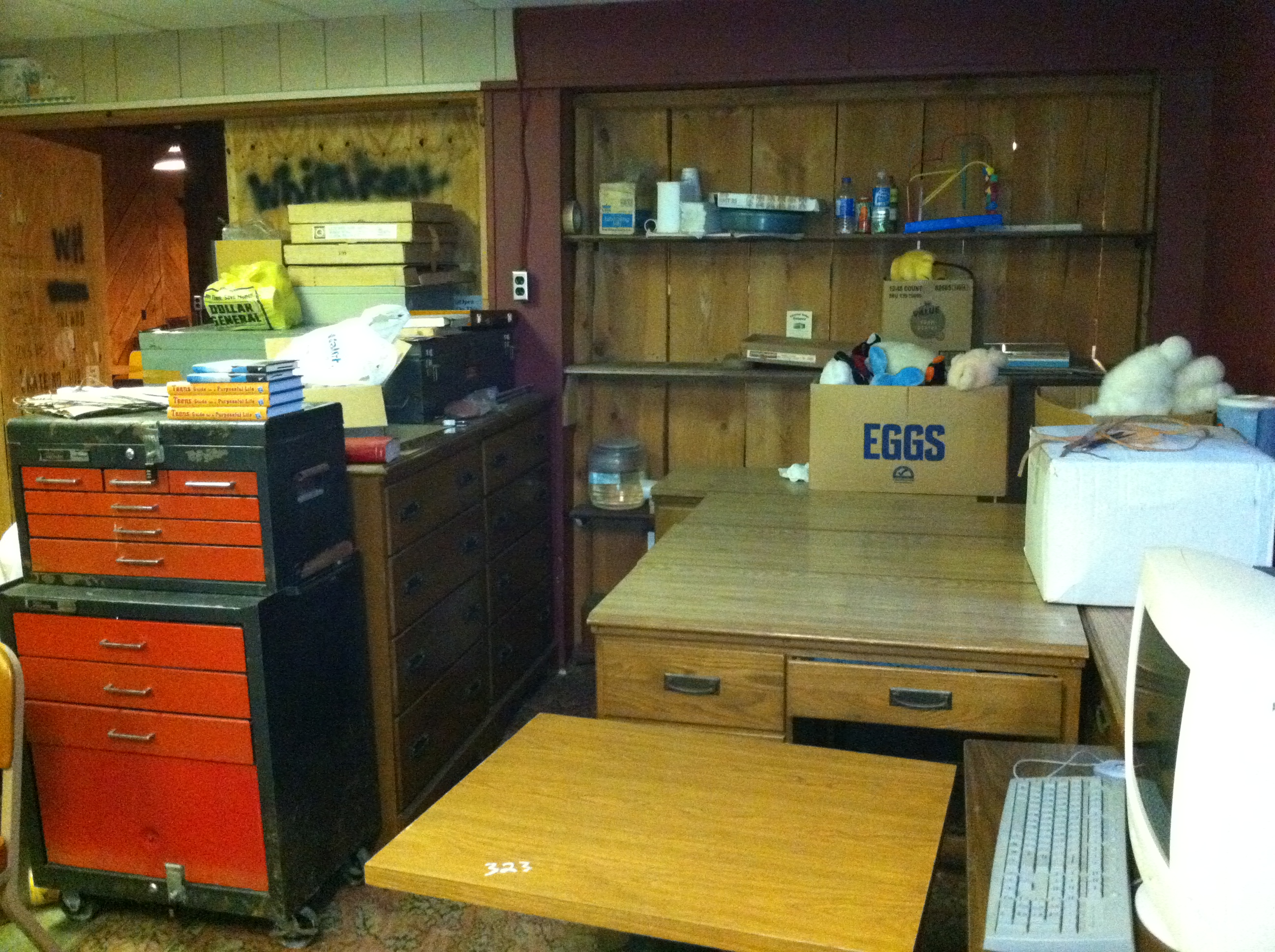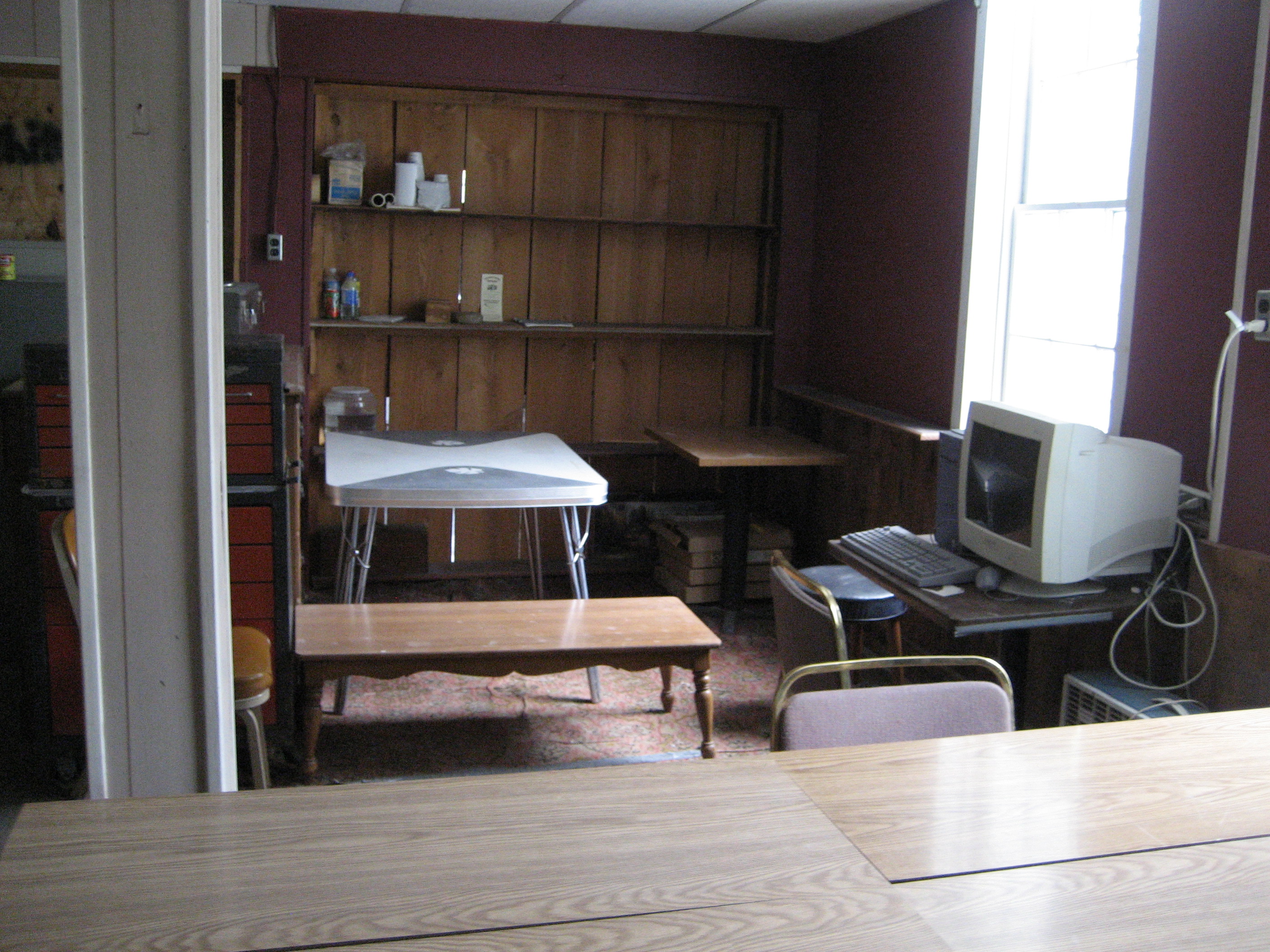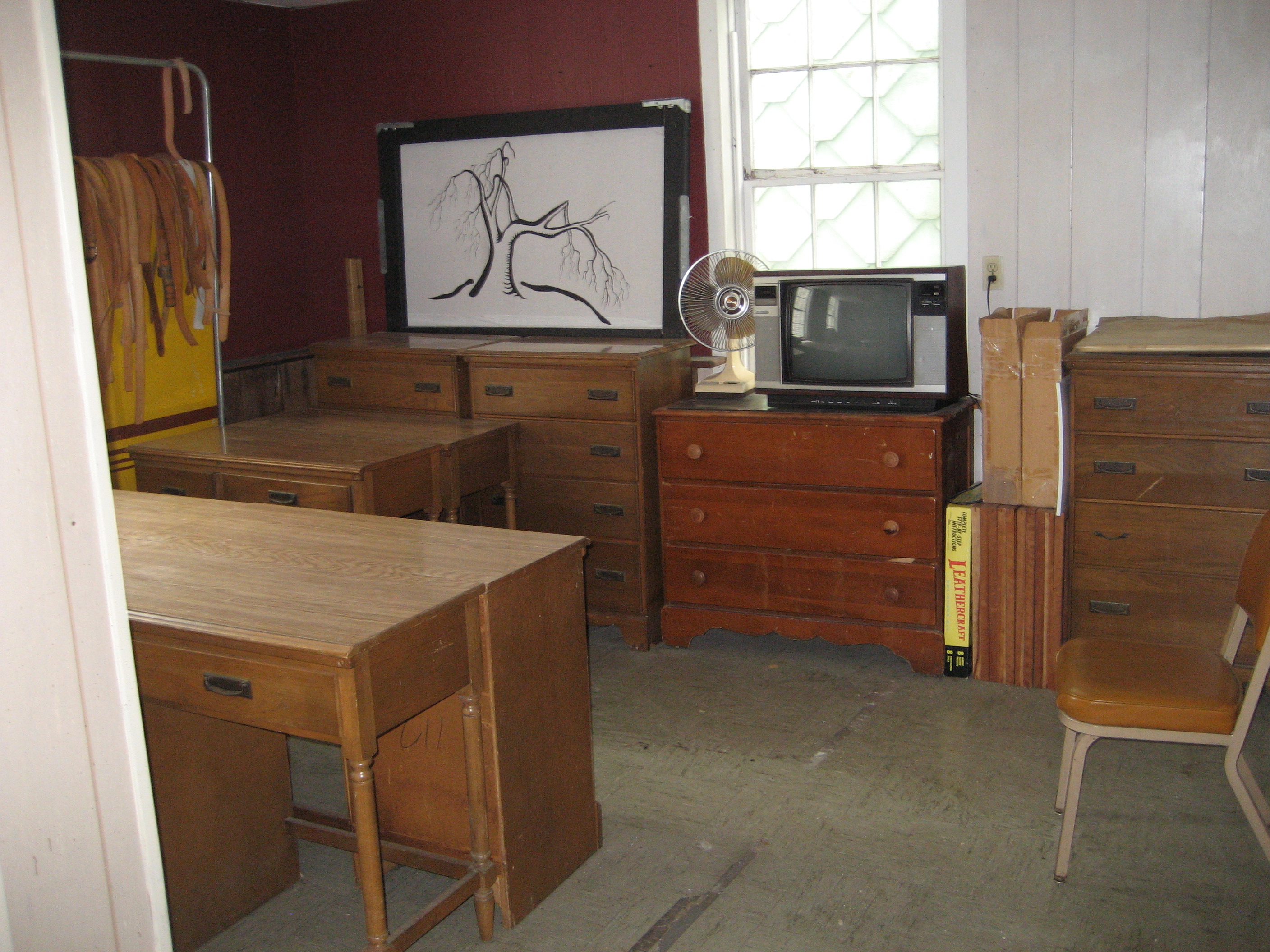 The second floor also had a craft room which housed an interesting assortment of stuff. Nancy had bought a complete leather shop from Clair when she was selling Bridge Antiques. Later she purchased a stain glass studio from a high school that was closing. We also has a bunch of dressers and tables from one of the off campus housing units for Clarion U.