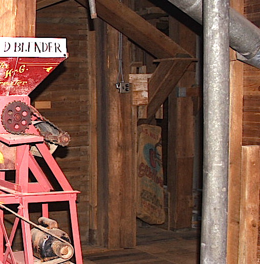 Pictured is the second floor seed blender which is the only piece of Mill equipment on the second floor. Most of the grain bins were removed in the 1990’s for the antique mall and some of the equipment was sold to Zanella Milling in West Sunbury which still operates a mill. In the enlarged photo, you can or can’t see a number of interesting facets of the Mill. There is a small selector there and a hatch that opens to a passage that went to the third floor. The hatch was big enough for a person so I was planning a secret ladder here to get to the third floor. Also back in the SW corner of the second floor was a large grain bin we had converted to a storage room. Daniel removed the sloped floor and we filled it with Simplicity pattern cabinets from Joann fabrics. Directly behind the blender is the wall of the grain bin with the climbing wall.