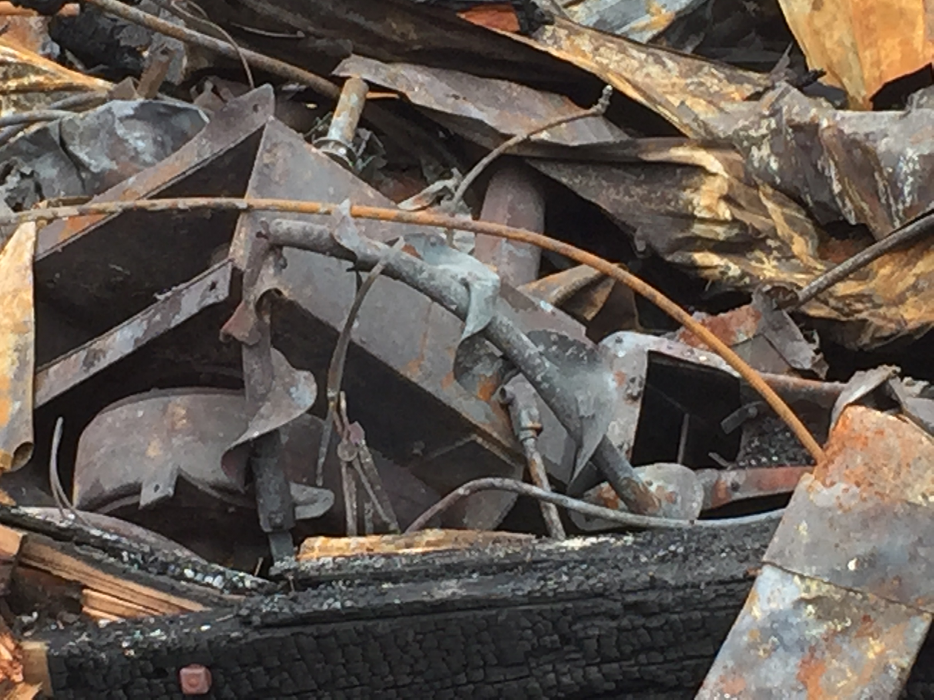 We found something in the fire pit that we didn’t recognize. It was an auger (see 4/3/15 post about the pair of pants packer in the first floor packing area). So we searched through our photos and found the motor and the belts and wheels that must have driven that auger. In ten years, I had never put this together until I saw the auger in the fire pit. Cool!