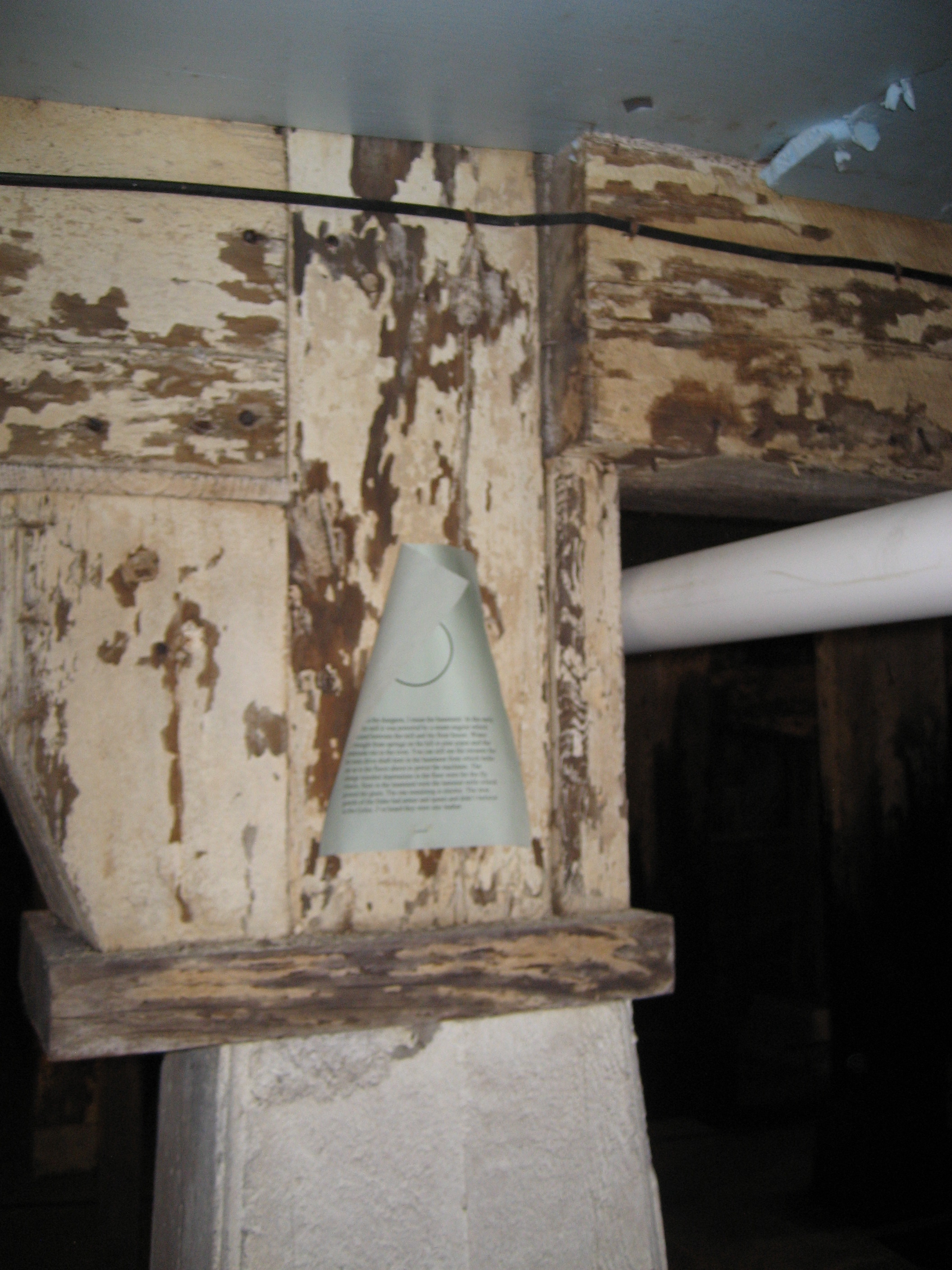 Welcome to the dungeon, I mean the basement. In the early days of the mill it was powered by a steam engine which was located between the mill and the flour house. Water was brought from springs on the hill in pine pipes and the condensate ran to the river. You can still see the mounts for the main drive shaft here in the basement from which belts ran up to the floors above to power the machines. The strange rounded depressions in the floor were for the fly wheels. Here in the basement were the hammer mills which ground the grain. The one remaining is electric. The iron guards of the Duke had armor and spears and didn’t believe in the Golux. I’ve heard they were into leather.