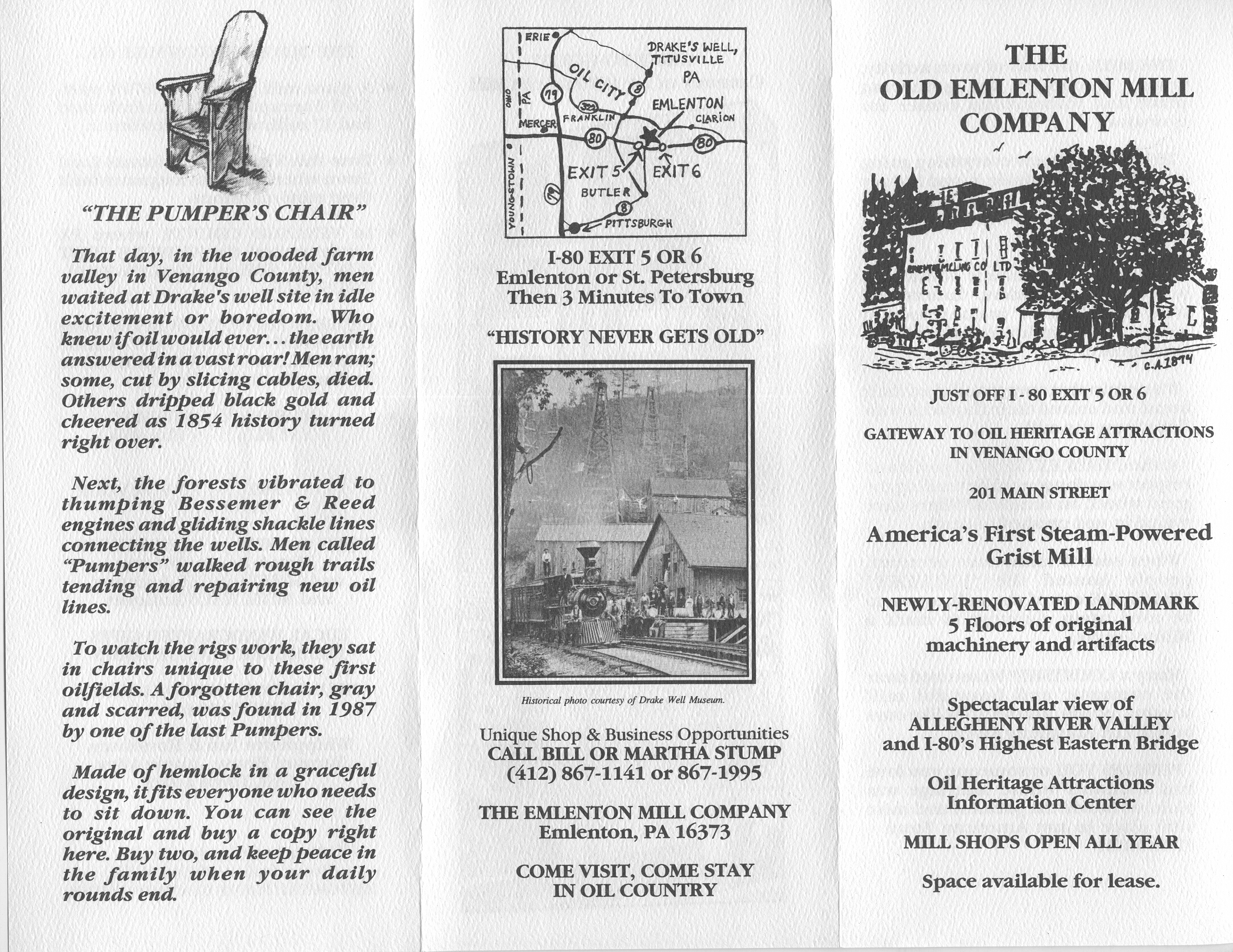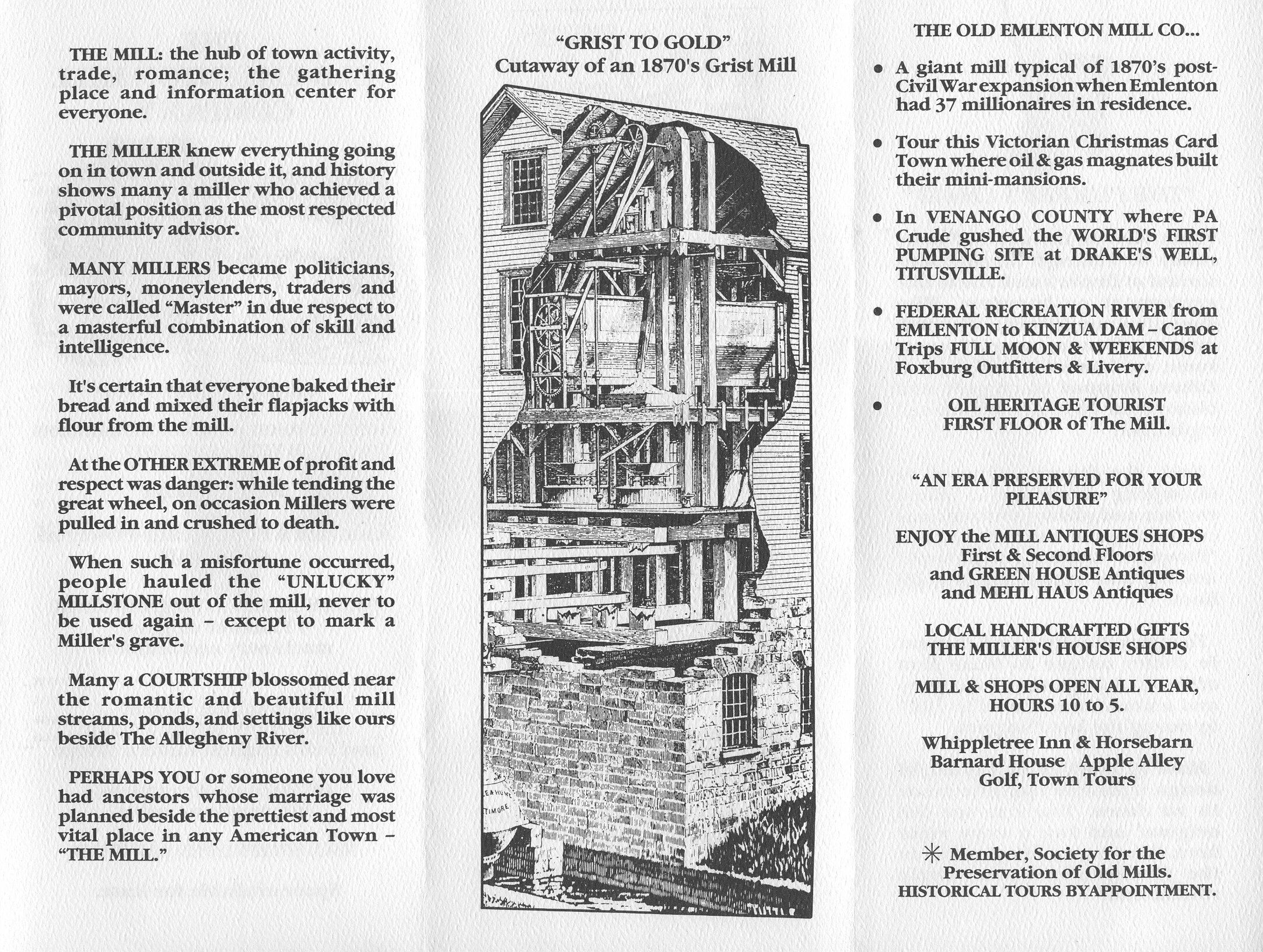 We purchased the Mill from Bill Stump of the Old Emlenton Mill Company in the Spring of 2005. The antique coop of the 1990’s closed before the turn of the century so the Mill had been closed for at least five years when we purchased it. It had a single layer of clapboard and Nancy was fond of saying the wind blew through it and the bats blew through it. We came to purchase the Mill because some Christian friends asked us to help them find a building in Emlenton for a coffee house. When Nancy prayed about it she felt the Lord tell her to buy the Mill. We had been living just outside Emlenton for five years and our former house in Murrysville had been on the market all that time. Miraculously, a buyer appeared with cash just in time to provide the funds to purchase the Mill. It was one of the first of many miracles connected with the Mill.