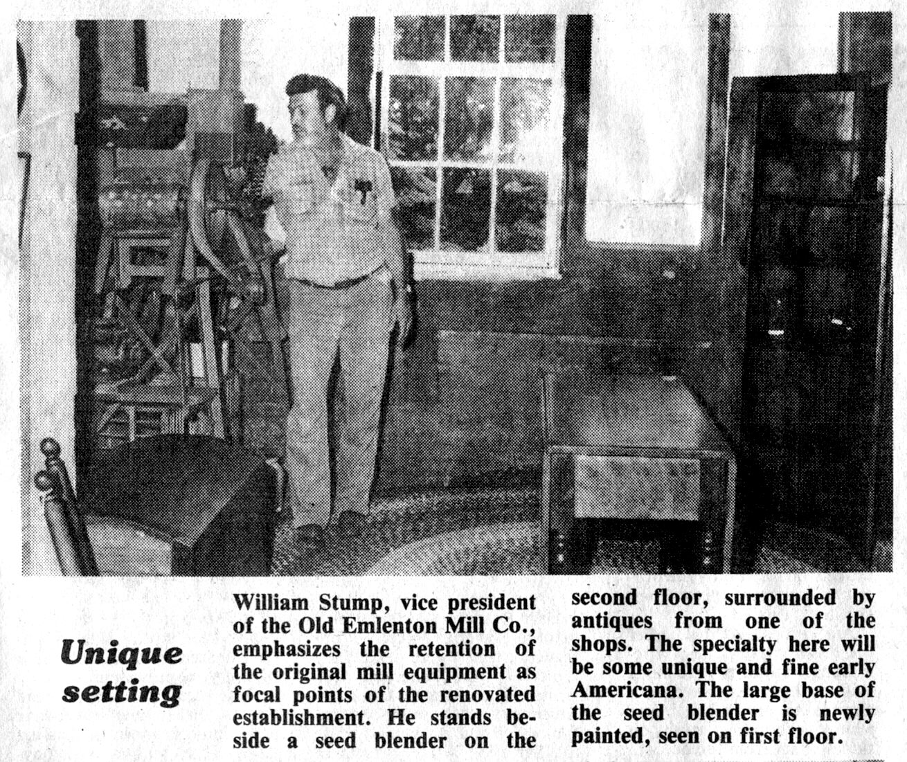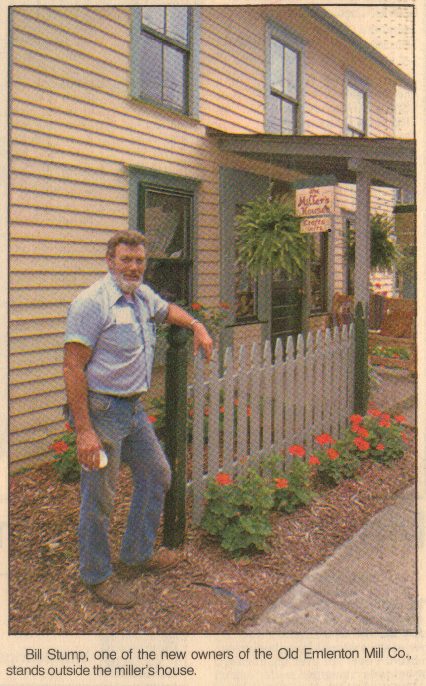 Renee Gendreau writing for the New Castle News in 11/7/1989 says: In the Summer of 1988, Bill Stump and Eugene “Twig” Terwilliger were the proud owners of a grist mill in Emlenton filled with such things as 200 gallons of rotted molasses with rats embalmed in it, pigeons, moldy grain, cobwebs and chickens. This summer, the Old Emlenton Mill Co. opened as a five story history book of shops featuring everything from hand painted replicas of the Mill and Victorian band boxes filled with candles, soaps and coffee to Radison canoes and small wooden furniture. “Bill’s still cleaning the place” said Martha Stump, Bill’s wife who helps with the “fun stuff” – public relations, tours and renting spaces. “The Mill’s like a hungry baby”. Terwilliger, Venango county’s last miller, met Stump, who also runs Calibration Services in Edinburg, as a customer of Twig’s Old Time Hardware Store, located next to the Mill.