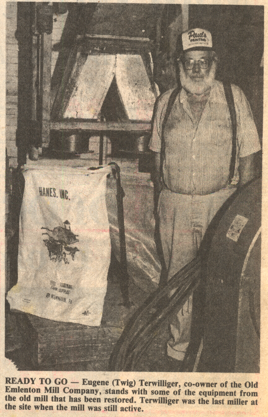 Lawrence Sanata writing for the Herald 8/25/1989 says: Eugene Terwilliger, “Twig”, had contemplated tearing down the towering Mill because of problems securing and paying insurance on the structure. (I’ve heard he had an Amish crew lined up to do the job) Terwilliger was the last in a long line of “millers”, the name given to Mill operators. He operated the Mill from 1947 to 1974. At one time, millers were the most influential members of the community, overseeing the most important industry in some towns. If not one of the most influential, he remains one of the most colorful. Troubled about the possibility of the Mill being torn down, Bill Stump, another long time Emlenton resident and businessman, teamed up with Twig. Together, they and some others transformed the old business into a new venture.