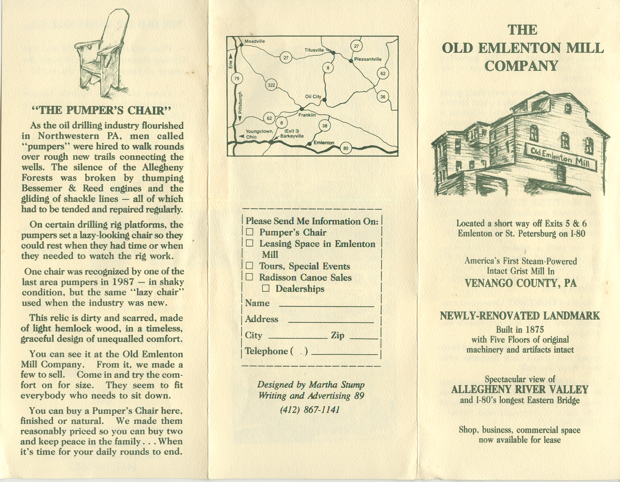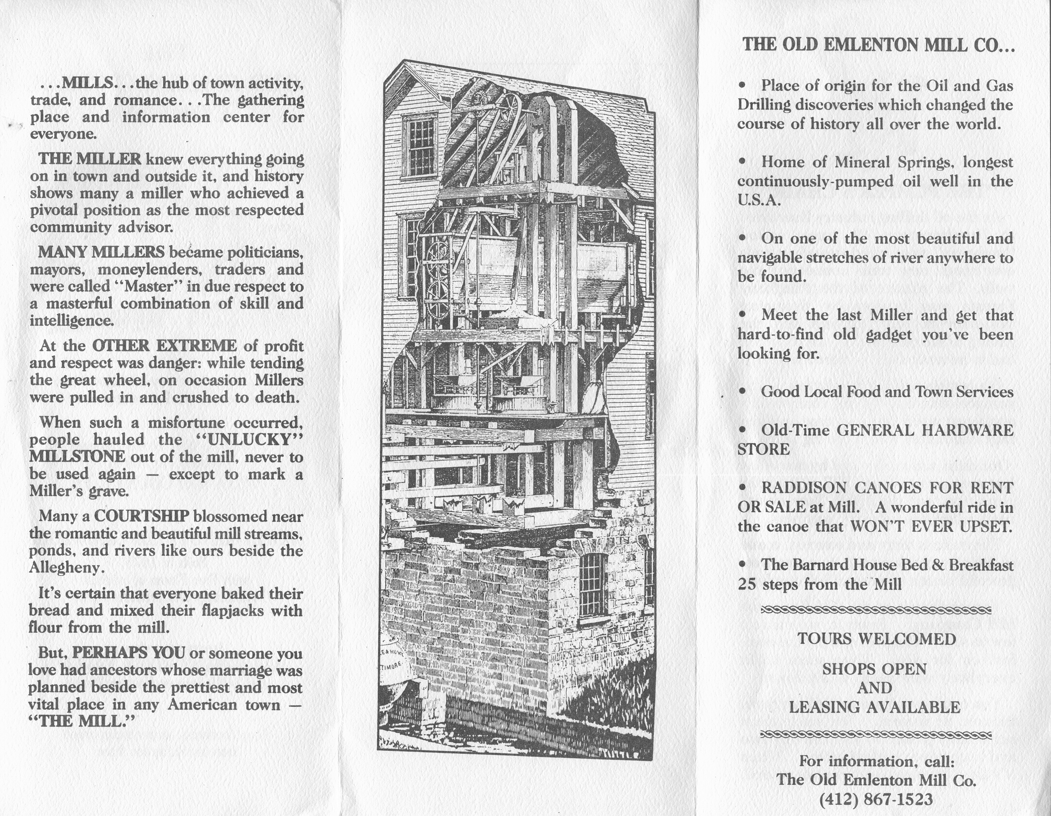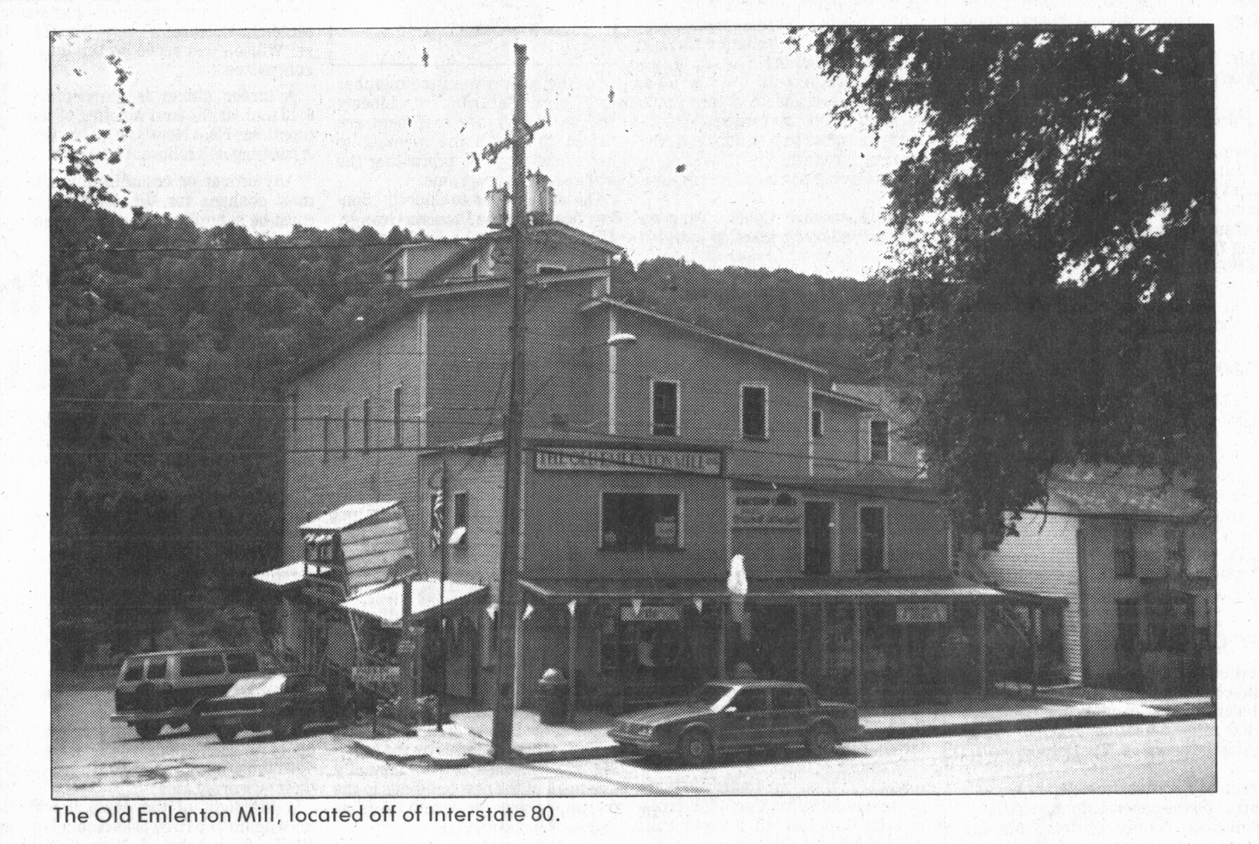 Lawrence Sanata writing for the Herald 8/25/1989 says: Tucked deep inside a cavernous valley with the Allegheny river at the bottom, sets a tiny community that was made famous by millionaires and millers. Today, a new generation of merchants is making a go of it. Long before highways crisscrossed western Pennsylvania, a drive through Emlenton was a necessity for some travelers and a delight for the merchants there. Construction of I80 changed all that, taking some of the luster from the once stately town. Today, Emlenton is best known for the incredibly high bridge on the nearby interstate. But an enterprising and enthusiastic group of people, some from this area, is hoping to steer people back into the tiny town by transforming the historic old Emlenton Mill into a retail center. Just a few years ago, the five story Mill that was built in 1875 and is boasted as America’s first steam powered intact grist Mill was a shabby looking place.