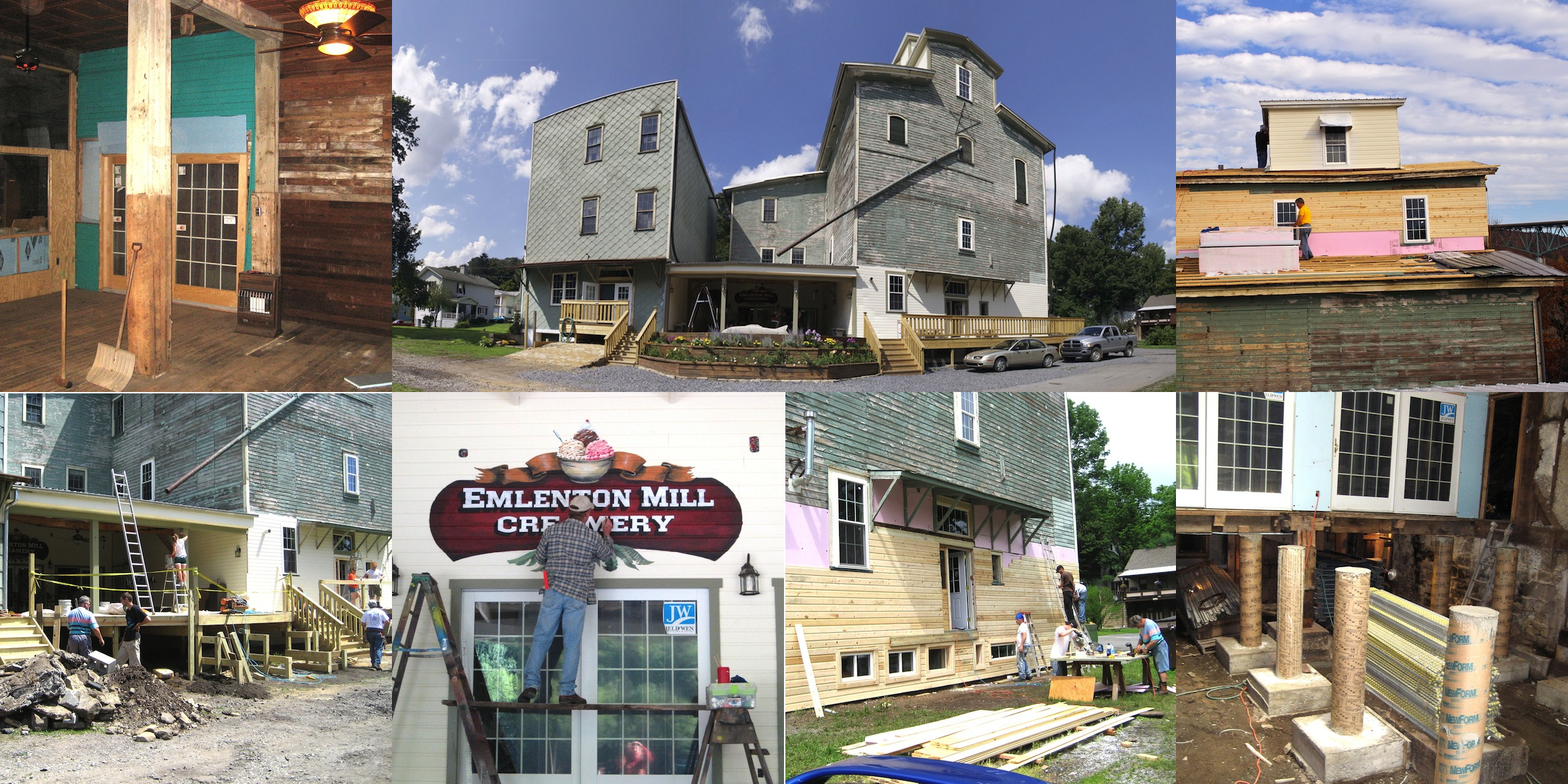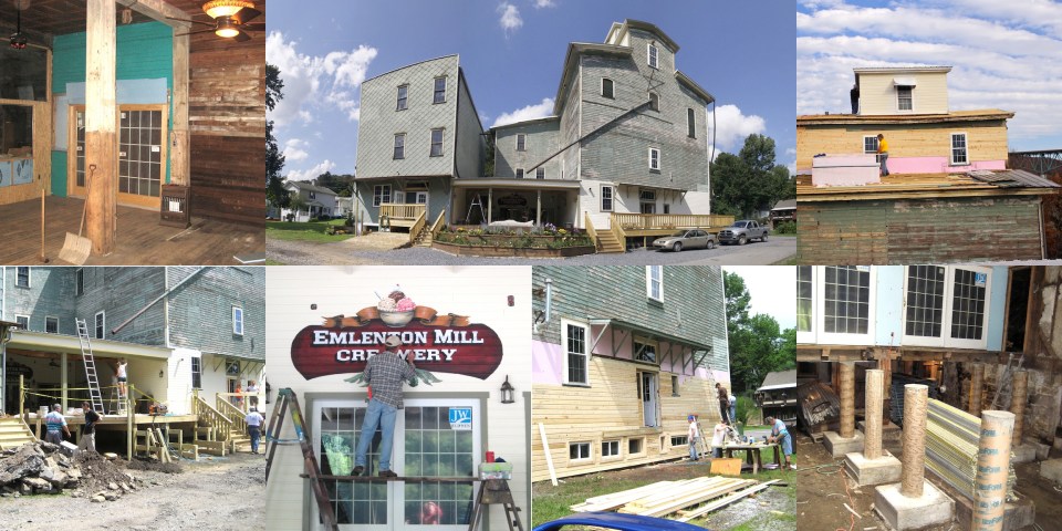 The Emlenton Mill was built in 1875 and ran for 100 years. During the 1980s the 1st and 2nd floor of the mill was run as an antique coop and major cleanup and electrical renovations were completed. The Mill was purchased by Paul and Nancy Newbury in 2005. With the help of Americorps and many other friends and family the patio, boardwalk, creamery and bunkhouse have been renovated. New roofing was added to the forth and fifth floor and new windows and siding has been added to much of the mill. There is still much to be done. Come and see what is happening at the Mill.