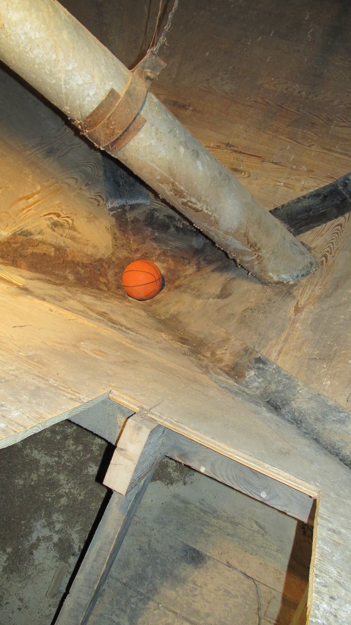 These pictures show a typical grain bin at the Emlenton Mill. At the bottom of the vertical picture you can see the sloping wall has been cut away revealing the horizontal sub floor and the supporting framework for the sloped walls. The basketball is sitting at the very bottom of the bin and covers the output chute. The horizontal picture shows the size of the bin and the three iron rods that keep the sides from bowing out due to the weight of the grain. The chute that passes through the bin and the floor is from a different bin and is just passing through. Tomorrow more about the 1970’s studio, WRCT and CMU.